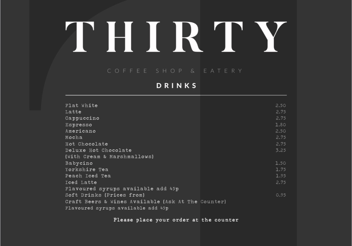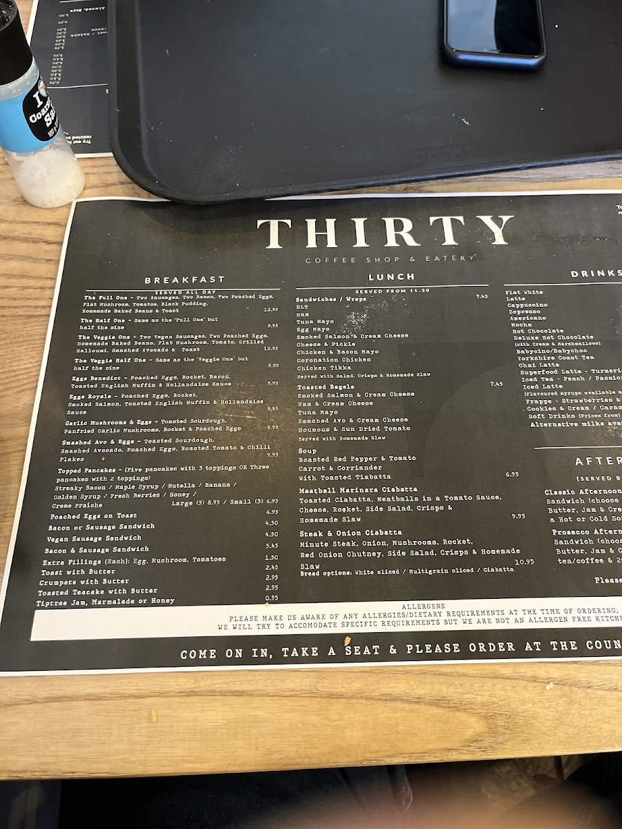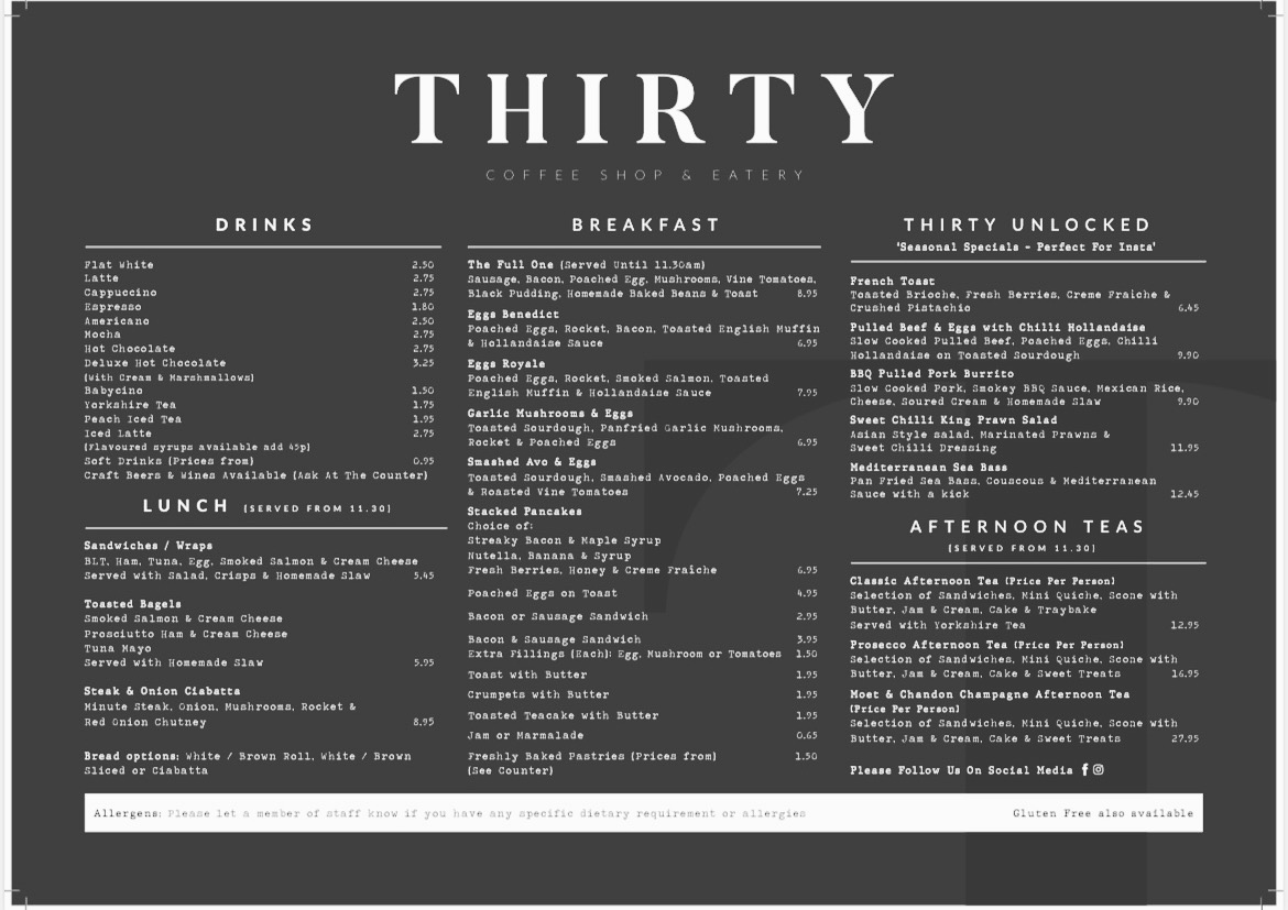 The Thirty Coffee Shop & Eatery Menu features a delightful array of dishes that cater to various tastes and preferences. Their breakfast options, such as the classic full English breakfast and freshly baked croissants, are perfect for early risers. For lunch, the homemade soups and hearty sandwiches, including a popular bacon and brie baguette, make for a satisfying meal. Vegan and gluten-free options are available, ensuring that everyone finds something to enjoy. Don’t miss their selection of cakes and pastries, which are ideal for a sweet afternoon treat.