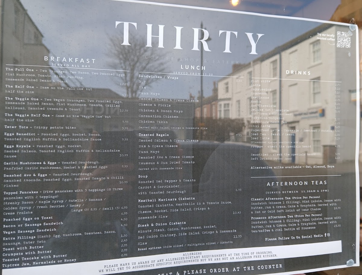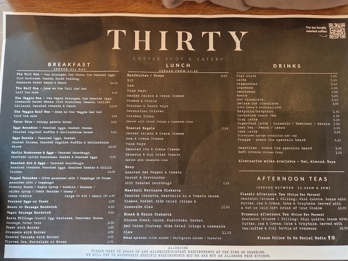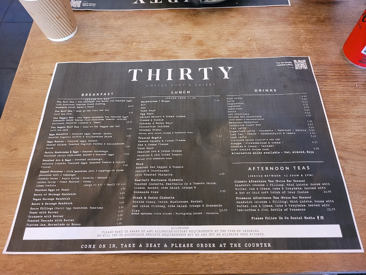 What sets Thirty Coffee Shop & Eatery apart from other establishments is its commitment to quality and attention to detail. The combination of a well-rounded menu, exceptional coffee, and a warm, inviting atmosphere makes it a standout choice for both locals and visitors to Filey. If you’re in the area, it’s definitely worth a visit.